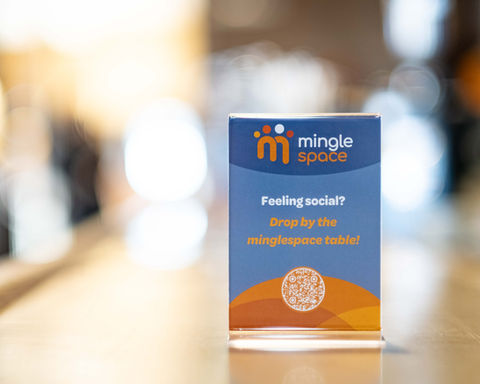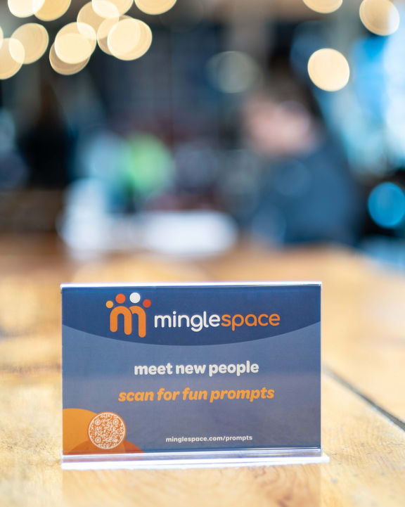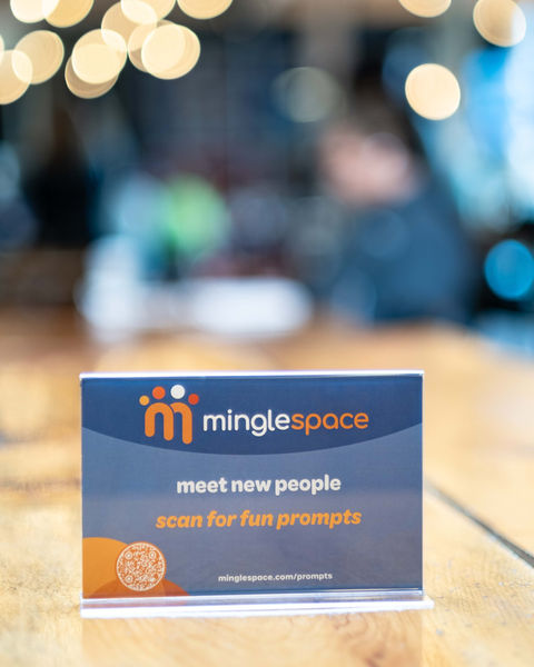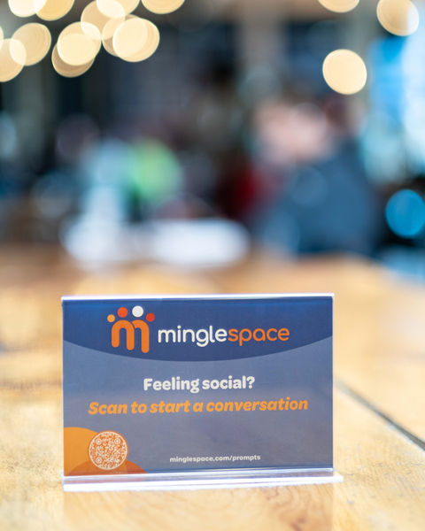 MingleSpaces make it easy for places to close that gap. A simple sign creates a connection spot — a table or area where anyone can drop in, scan a QR code, and start talking through built-in prompts and light activities. A MingleSpace isn’t an event, and it doesn’t require an RSVP or profile. It’s simply an open spot to meet new people — a space designed to help strangers start talking and share ideas.