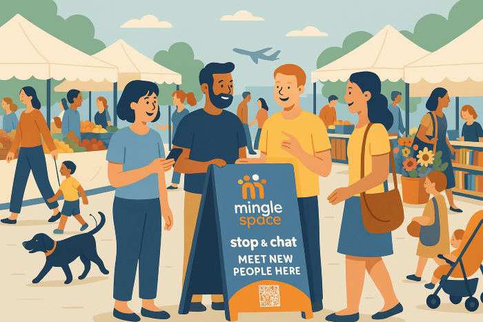 MingleSpaces make it easy for places to close that gap. A simple sign creates a connection spot — a table or area where anyone can drop in, scan a QR code, and start talking through built-in prompts and light activities. A MingleSpace isn’t an event, and it doesn’t require an RSVP or profile. It’s simply an open spot to meet new people — a space designed to help strangers start talking and share ideas.