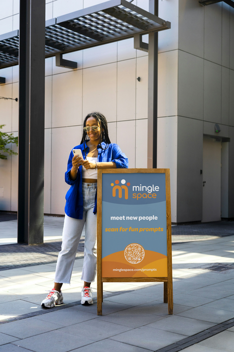 MingleSpaces make it easy for places to close that gap. A simple sign creates a connection spot — a table or area where anyone can drop in, scan a QR code, and start talking through built-in prompts and light activities. A MingleSpace isn’t an event, and it doesn’t require an RSVP or profile. It’s simply an open spot to meet new people — a space designed to help strangers start talking and share ideas.